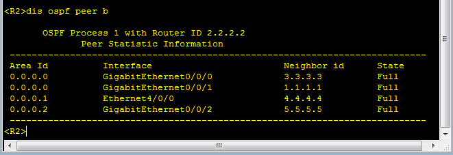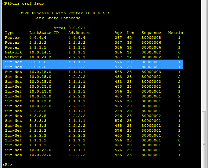 可以看到,R4的LSDB中只有2条表示缺省路由的Type-3 LSA,没有任何其他Type-3 LSA,路由表中也不存在任何域间路由,只有一条缺省路由。