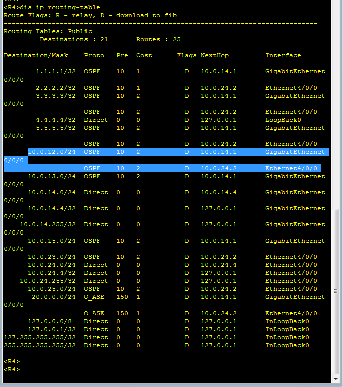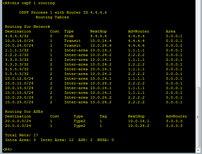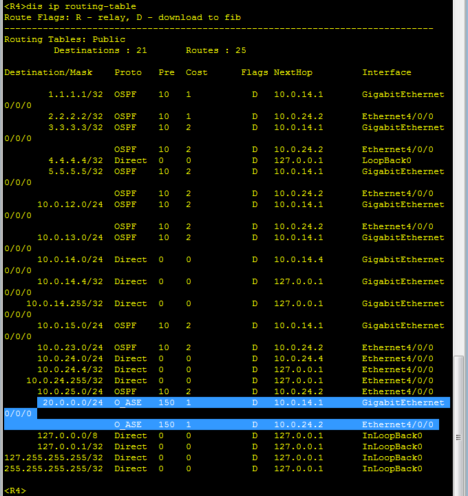 可以看到,R4有两条去往外部网络20.0.0.0/24的路由,下一跳分别为10.0.14.1和10.0.24.2,开销值都是1,类型是Type-2。