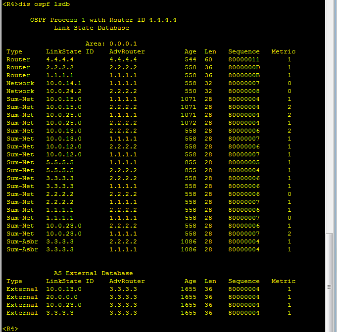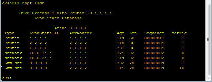 在R4的LSDB中,已经没有了任何Type-5和Type-4 LSA条目,并且多了两个Type-3 LSA(Sum-Net LSA)。这两条Type-3的LinkState ID为 0.0.0.0,说明