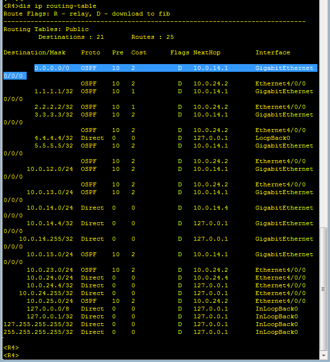 R4 的外部路由条目消失了,取而代之的是一条缺省路由。