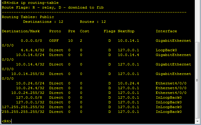 有两个下一跳地址,即10.0.12.1, 和 10.0.24.2,形成了负载均衡