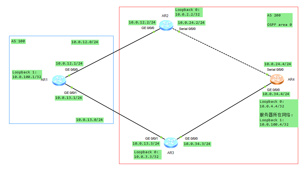 实验拓扑如下图所示,实验编址如图,R1属于AS 100, R2、R3和R4属于AS 200。R1的Loopback 1接口模拟客户所在的网络,R4的Loopback 1接口模拟目标服务器所在的网络。所