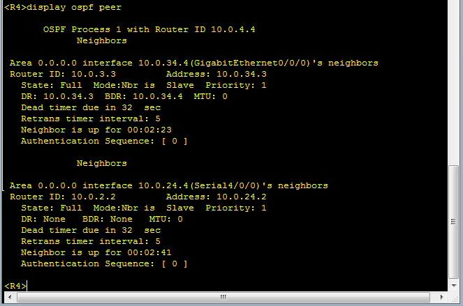上述配置完成后,在R4上查看OSPF邻居关系: