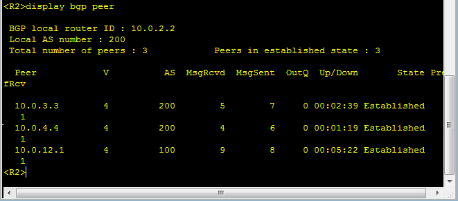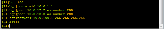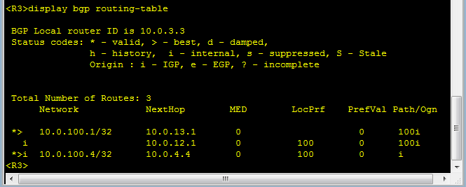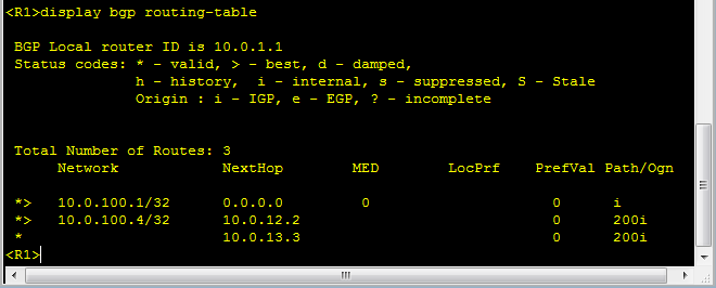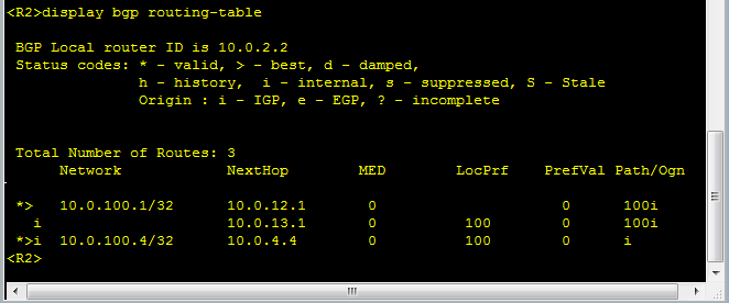 可以看到,R1的BGP路由表中有两条去往10.0.100.4/32的路由信息,下一跳分别为R2和R3。R1通告的10.0.100.1/32网络的Next Hop为0.0.0.0,