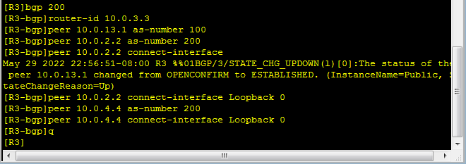 在R2上使用peer 10.0.4.4 next-hop-local和peer 10.0.3.3 next-hop-local命令,使BGP路由信息传递给IBGP对等体R4和R3时,使用R2发送BGP报文
