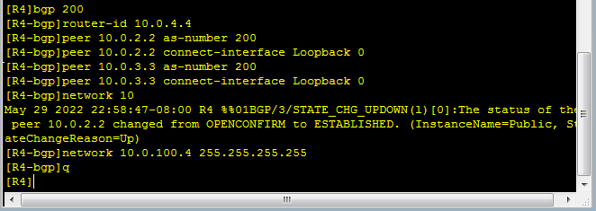 可以看到,在R4的BGP路由表中,BGP路由协议选择了Next Hop为10.0.2.2的路由作为去往10.0.100.1/32的最佳路由。