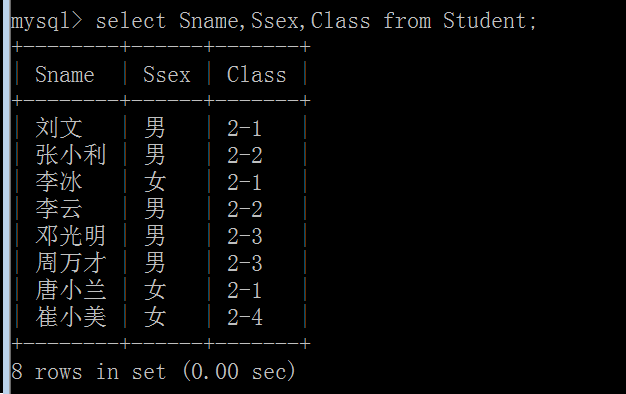 (1)查询Student表中的所有记录的Sname,Ssex和Class列;