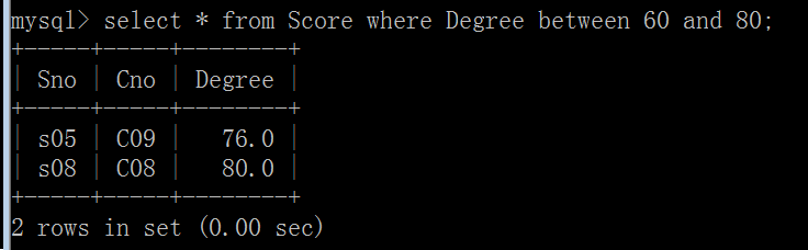 (4)查询Score表中成绩在60至80之间的所有记录:
