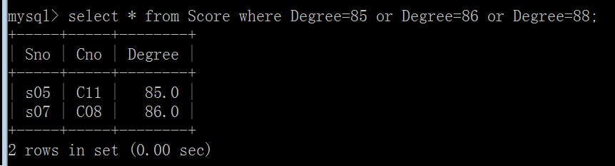 (5)查询Score表中的成绩为85,86和88的记录: