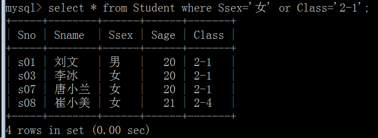 (6)查询Student表中“2-1”班或性别为“女”的同学记录: