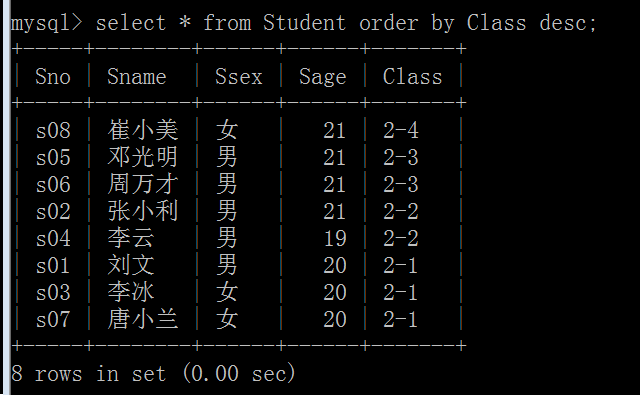 (7)以Class降序查询Student表的所有记录: