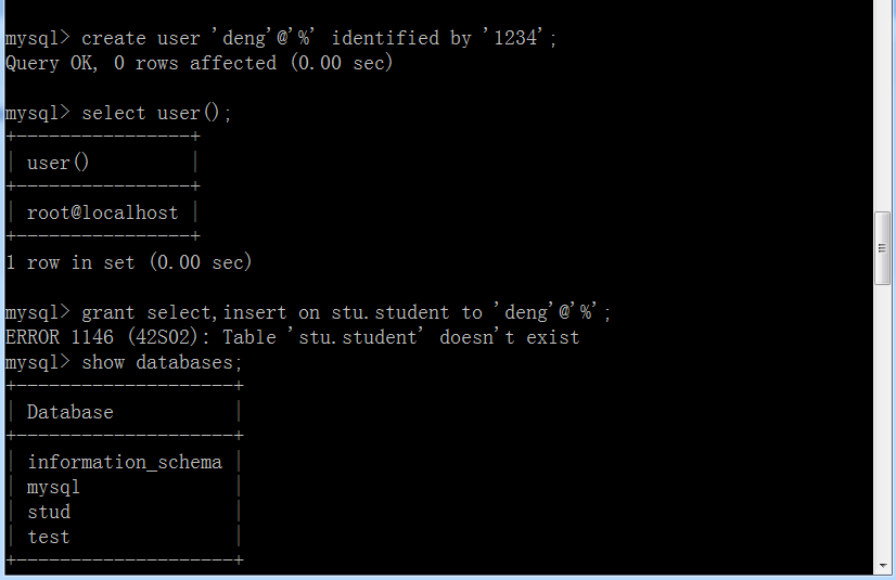 create user 'deng'@'%' identified by '1234' 用户名:deng 密码:1234