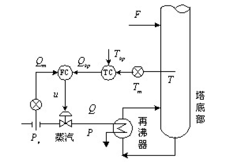 蒸汽流量作为副参数,与主参数(提馏段温度)组成如上图所示的串级控制系统,以提高控制系统的抗干扰能力,如下图。