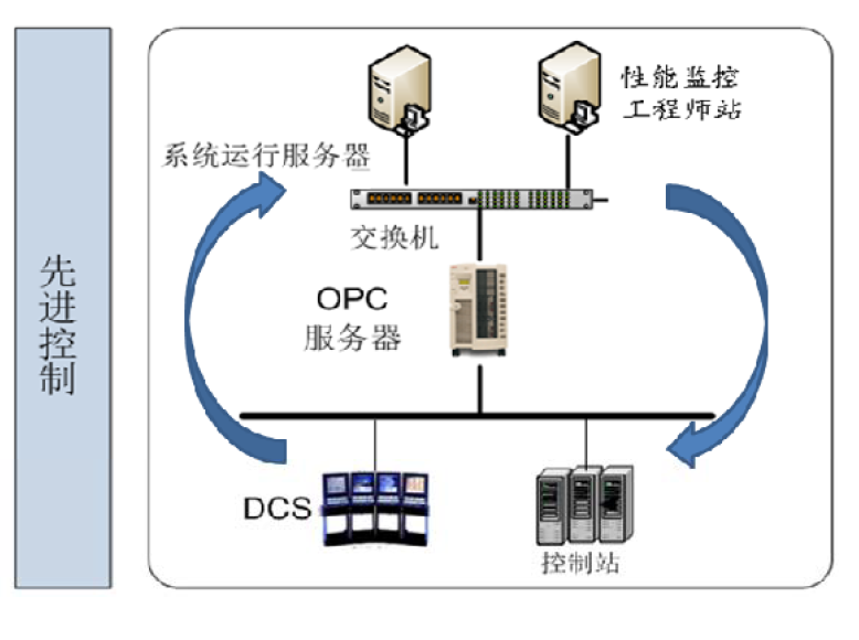 先进控制模块运行在上位机服务器端。在DCS操作站新建先进控制画面用于监控与操作。通过OPC接口实现先进控制服务器与DCS间的数据通讯。先进控制通过OPC从DCS读取数据,并根据变量间模型关系计算出调节量,然后将该调节量通过OPC写入常规PID控制回路的设定值,进而控制现场执行机构,实现变量的闭环控制。
