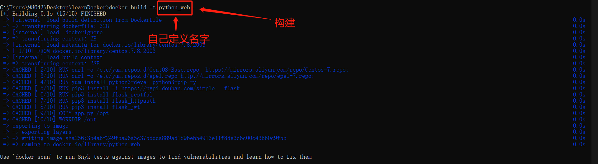 进入learnDocker 构建镜像(-t 后面是跟起的镜像名字,名字必须是小写)