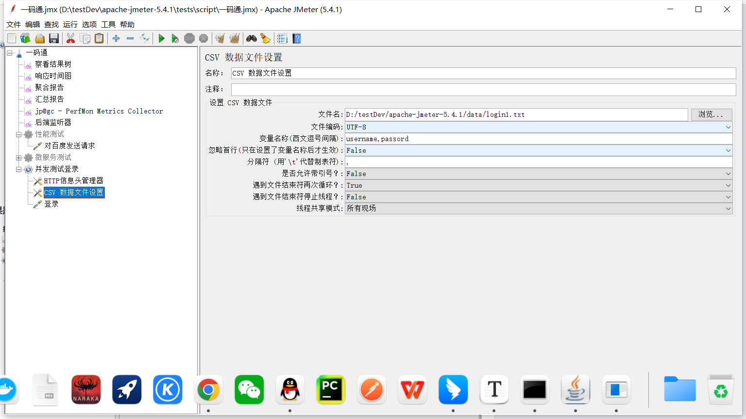 2.添加一个CSV数据文件设置,在文件名处点击浏览,找到login1.txt存放的目录位置,文件编码选择UTF-8,变量名称填写username,password