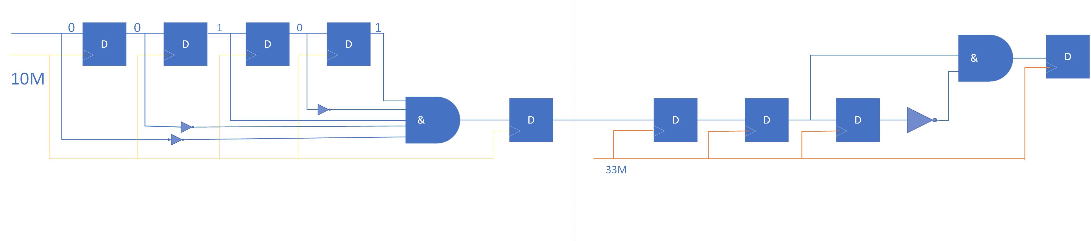 例:10M时钟域中传送到33M时钟域中,并检测出序列10100;