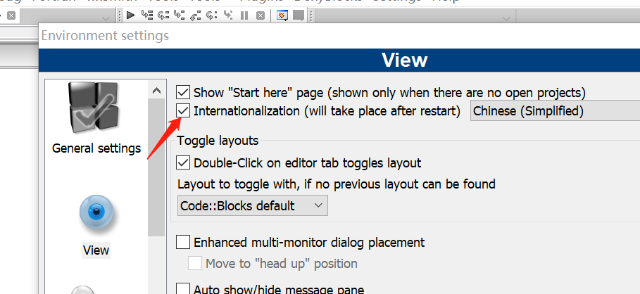 第二步在codeblocks 的settings-->Environment-->viwe-->Internationlization 下选择chinese(simplifield),并点击“OK”;
