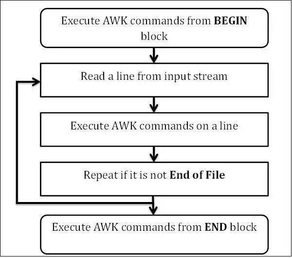 awk工作流程是这样的:先执行BEGING,然后读取文件,读入有/n换行符分割的一条记录,然后将记录按指定的域分隔符划分域,填充域,$0则表示所有域,$1表示第一个域,$n表示第n个域,随后开始执行模式所对应的动作action。接着开始读入第二条记录······直到所有的记录都读完,最后执行END操作。
