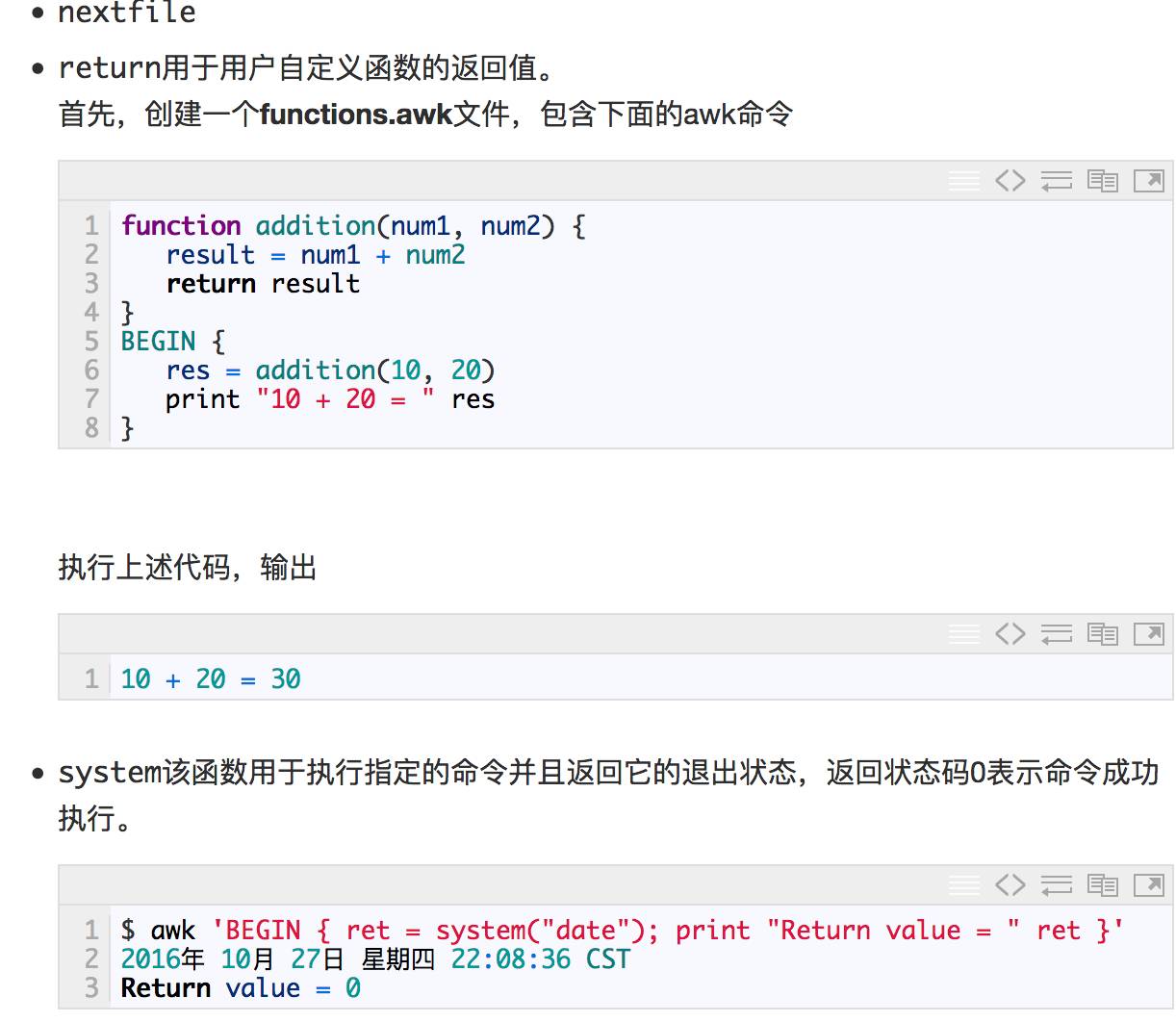 system函数用于执行操作系统命令并且返回命令的退出码到awk。
