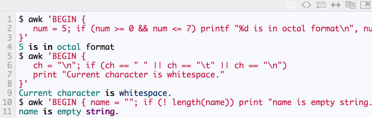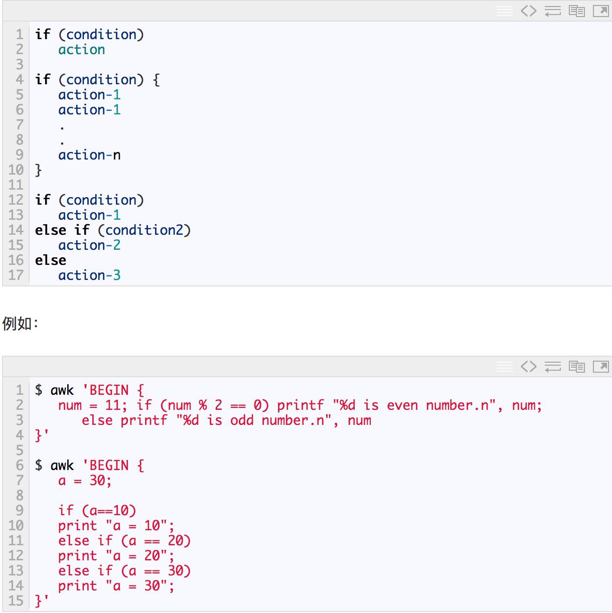 awk中的条件语句是从C语言中借鉴来的,见如下声明方式: