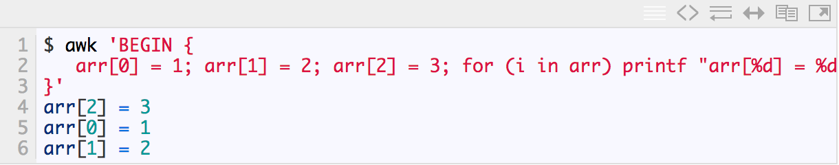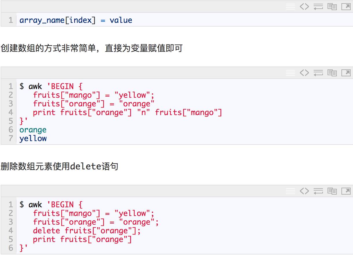 AWK支持关联数组,也就是说,不仅可以使用数字索引的数组,还可以使用字符串作为索引,而且数字索引也不要求是连续的。数组不需要声明可以直接使用,语法如下: