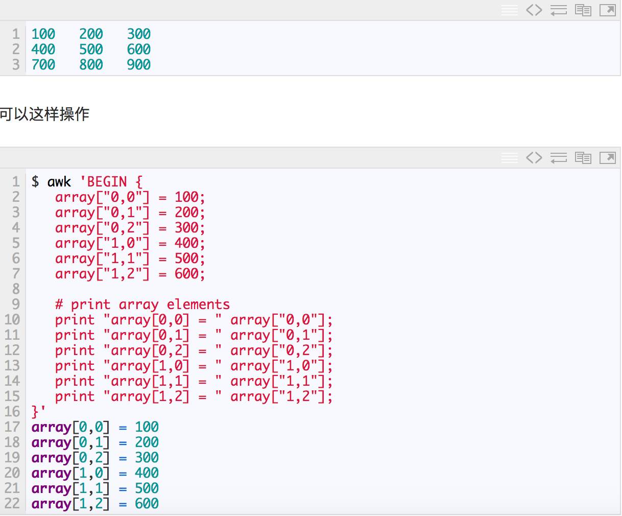 在AWK中,只支持一维数组,但是可以通过一维数组模拟多维,例如我们有一个3×3的三维数组