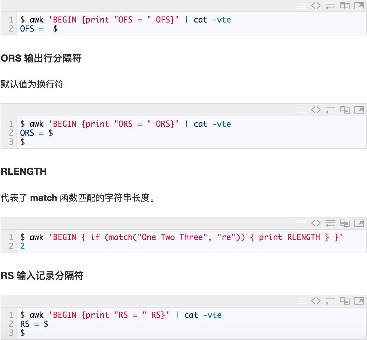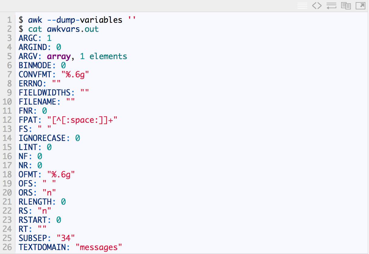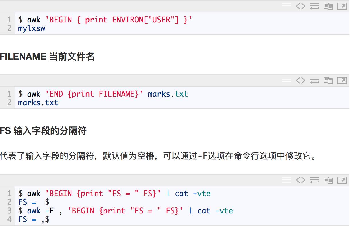 awk有许多内置变量用来设置环境信息,这些变量可以被改变,下面给出了最常用的一些变量。