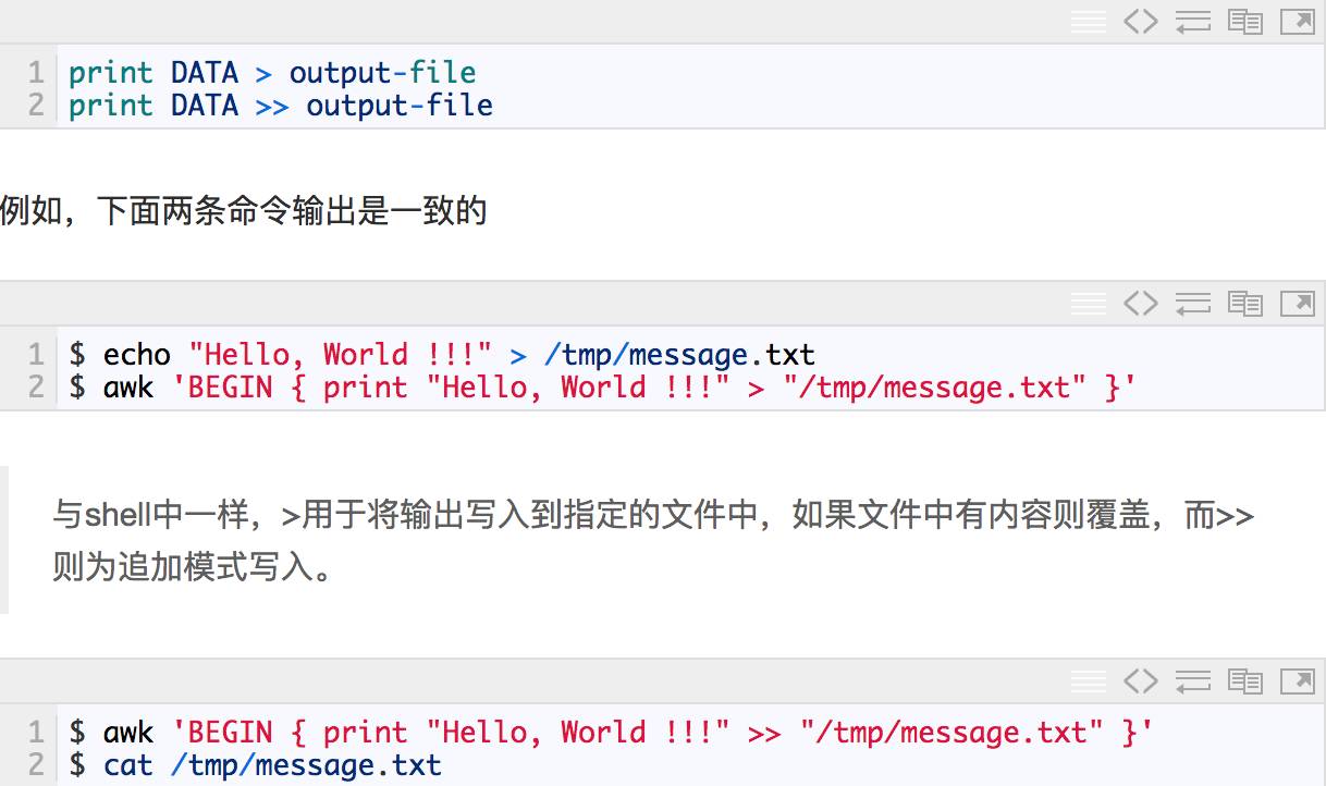 到目前为止,我们所有的程序都是直接显示数据到了标准输出流,其实,我们也可以将输出重定向到文件。重定向操作符跟在print和printf函数的后面,与shell中的用法基本一致。