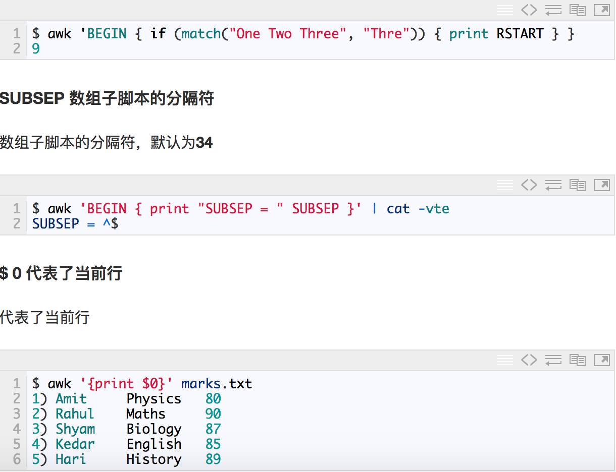 此外,$0变量是指整条记录。$1表示当前行的第一个域,$2表示当前行的第二个域,......以此类推。