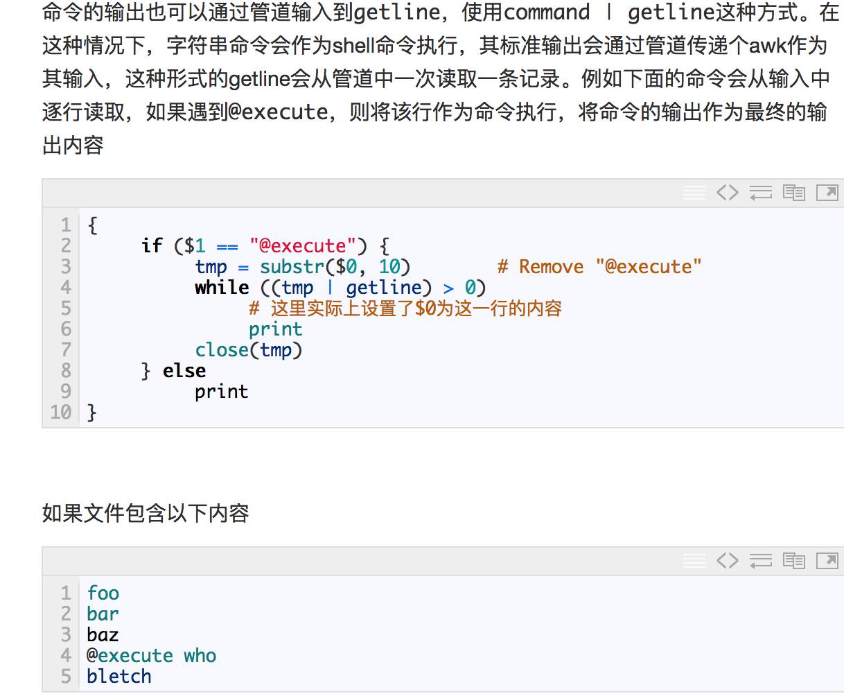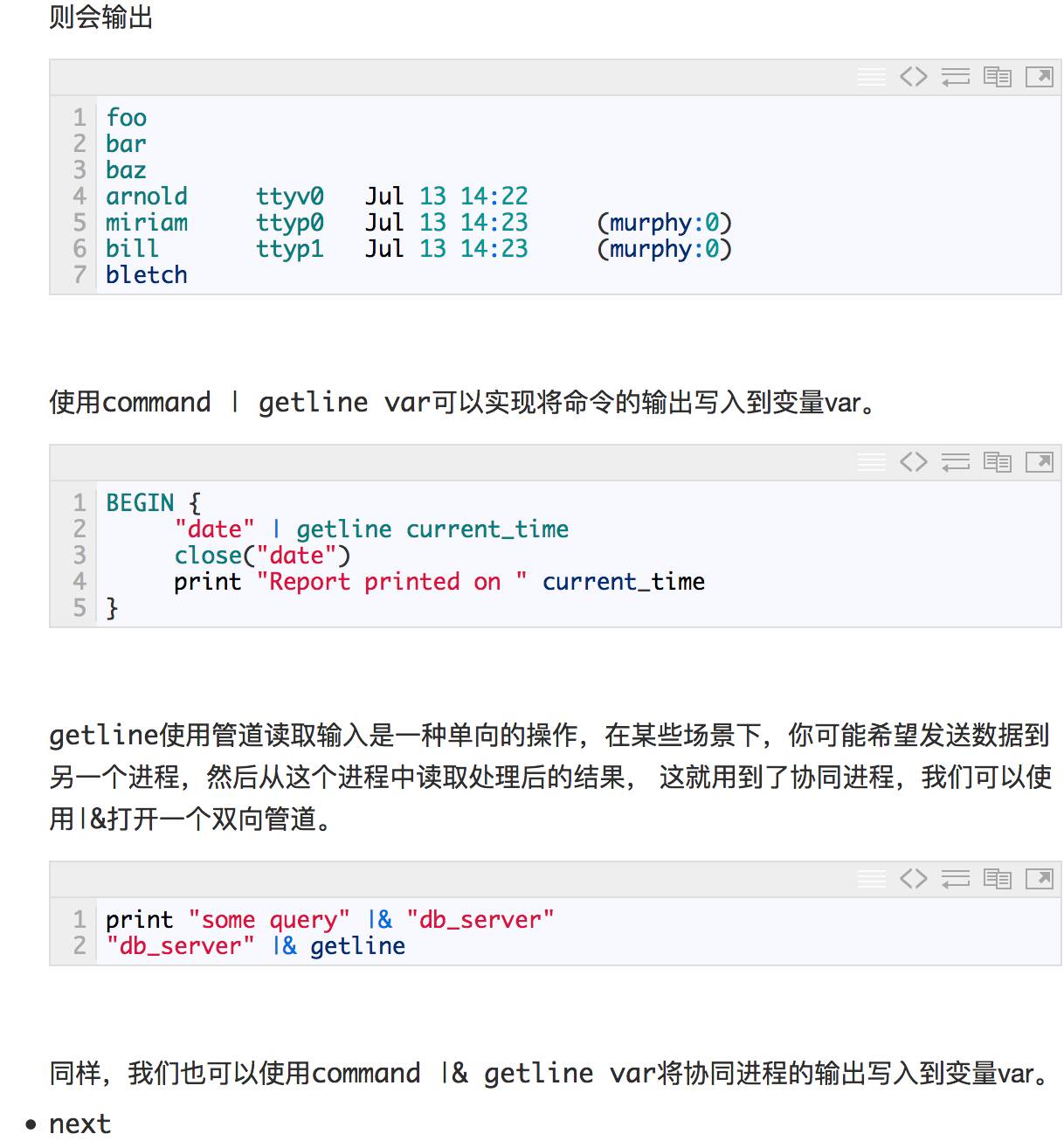 注意:目前协同进程的标准错误输出将会和gawk的标准错误输出混杂在一起,无法单独获取标准错误输出。另外,I/O缓冲可能存在问题,gawk程序会自动的刷新所有输出到下游的协同进程的管道。但是,如果协同进程没有刷新其标准输出的话,gawk将可能会在使用