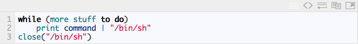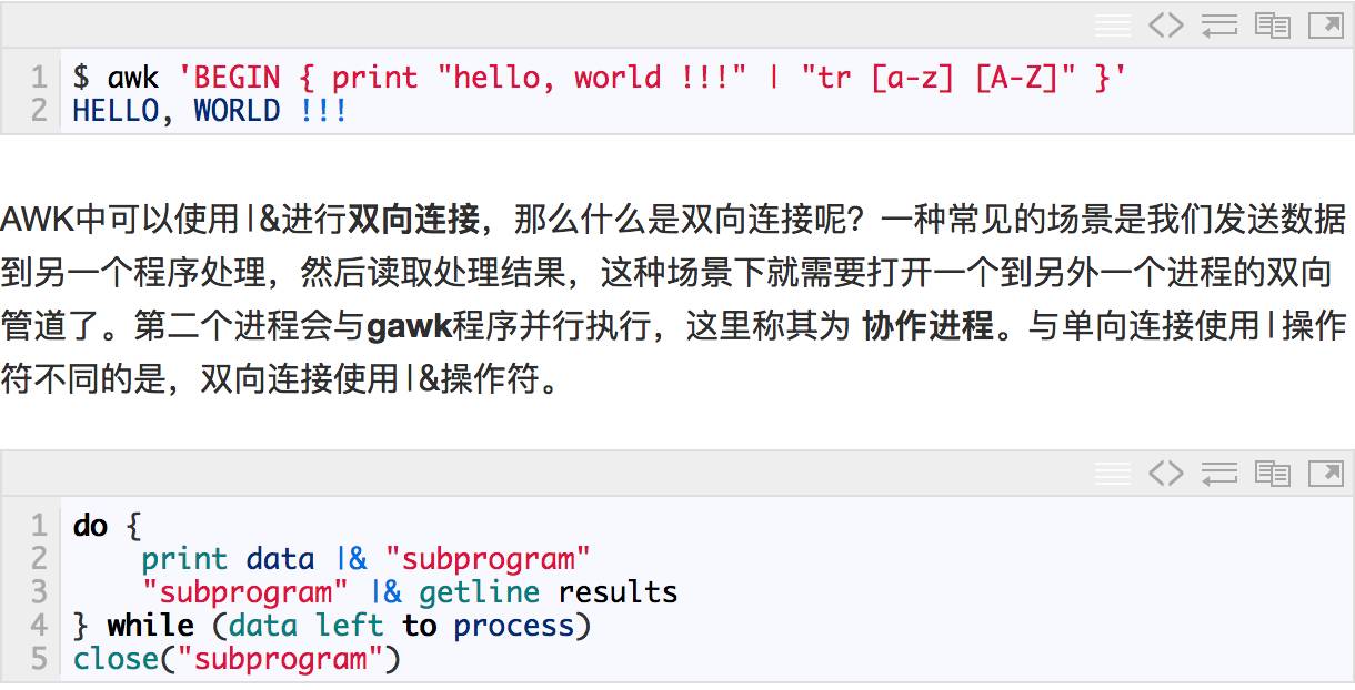 第一次I/O操作使用了|&操作符,gawk会创建一个到运行其它程序的子进程的双向管道,print的输出被写入到了subprogram的标准输入,而这个subprogram的标准输出在gawk中使用getline函数进行读取。