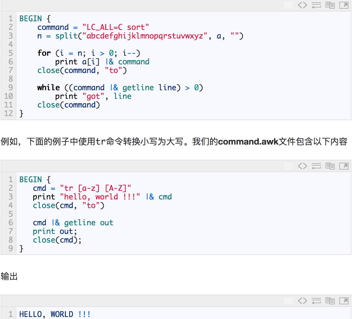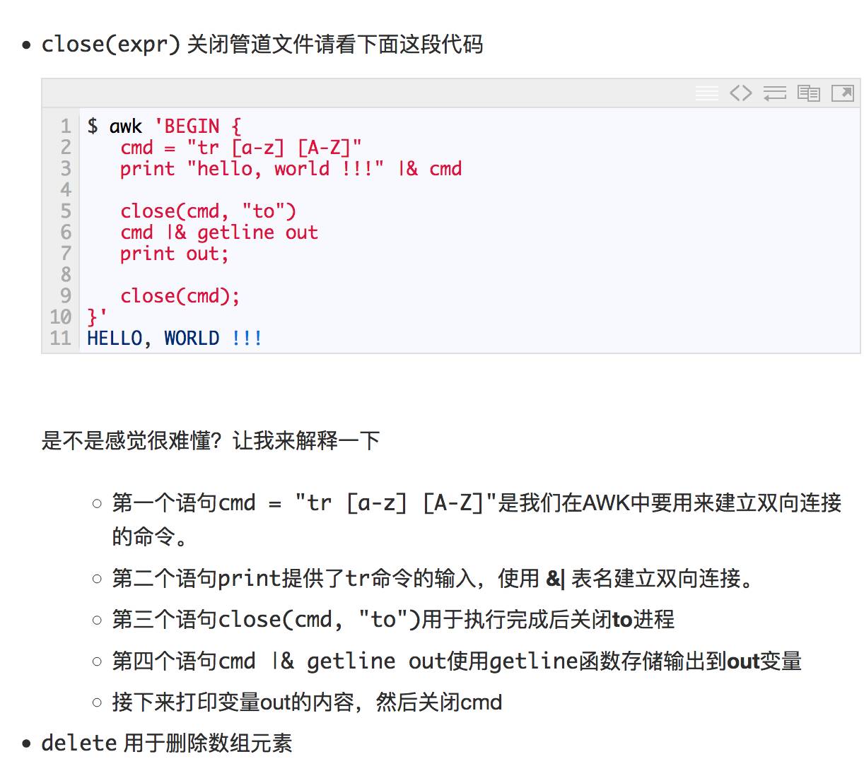 首先,第一行 cmd = “tr [a-z] [A-Z]” 是在AWK中要建立双向连接的命令