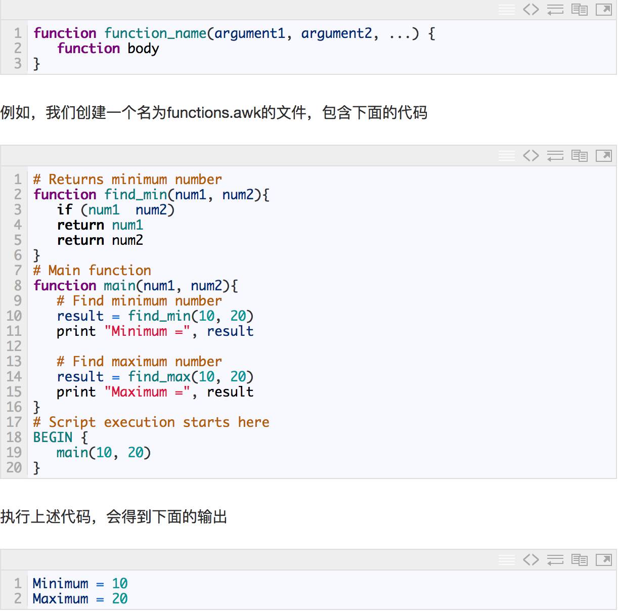 函数是程序基本的组成部分,AWK允许我们自己创建自定义的函数。一个大型的程序可以被划分为多个函数,每个函数之间可以独立的开发和测试,提供可重用的代码。