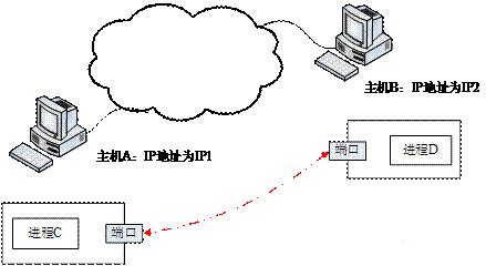 在网络中,不同计算机是通过IP地址来区分的,也就是说,要将数据由主机A发送到主机B,只要知道主机B的IP地址就可以确定数据要发送的目的地。但是,在主机A与B中不可能只有进程C和进程D两个进程。主机B在收到主机A发送来的数据后,如何才能确定该数据是发送给进程D?因此,还需要某种标识信息,用于描述网络通信数据发往的进程。TCP/IP协议提出了协议端口的概念,用于标识通信的进程。