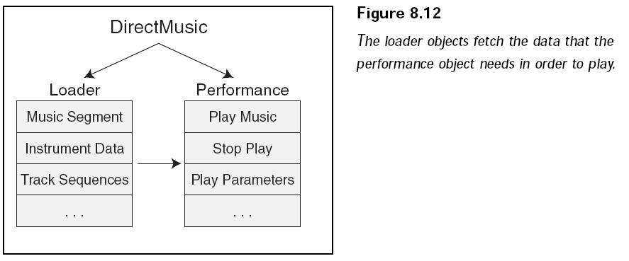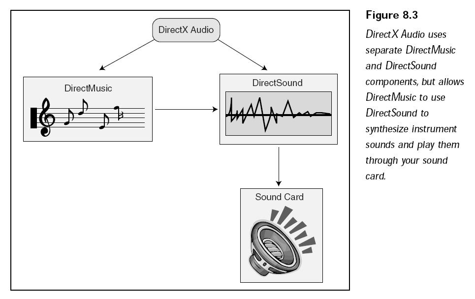Direct Audio是一个复合组件,它由DirectSound和DirectMusic两个组件组成。DirectMusic在DirectX8中得到了巨大的增强,但是DirectSound基本保持原有的状态。DirectSound是主要的数字声音回放组件。DirectMusic处理所有的乐曲格式,包括MIDI、DirectMusic本地格式文件和波表文件。DirectMusic处理完之后将它们送入DirectSound中做其他处理,这意味着回放MIDI的时候可以使用数字化的乐器。