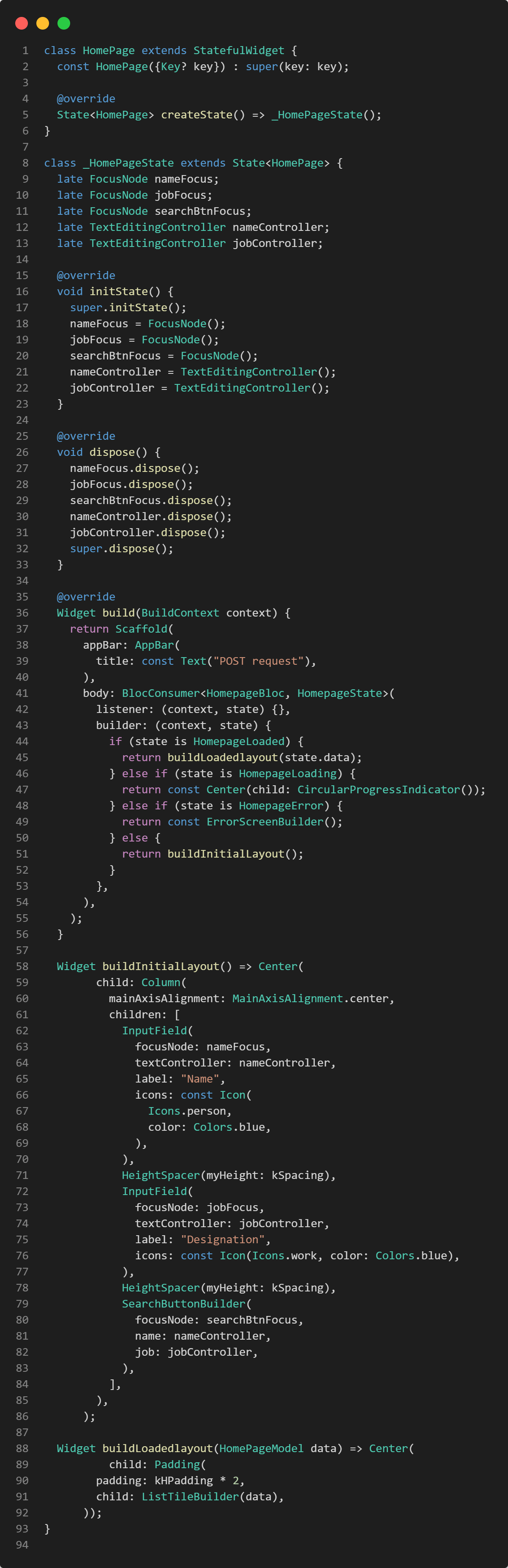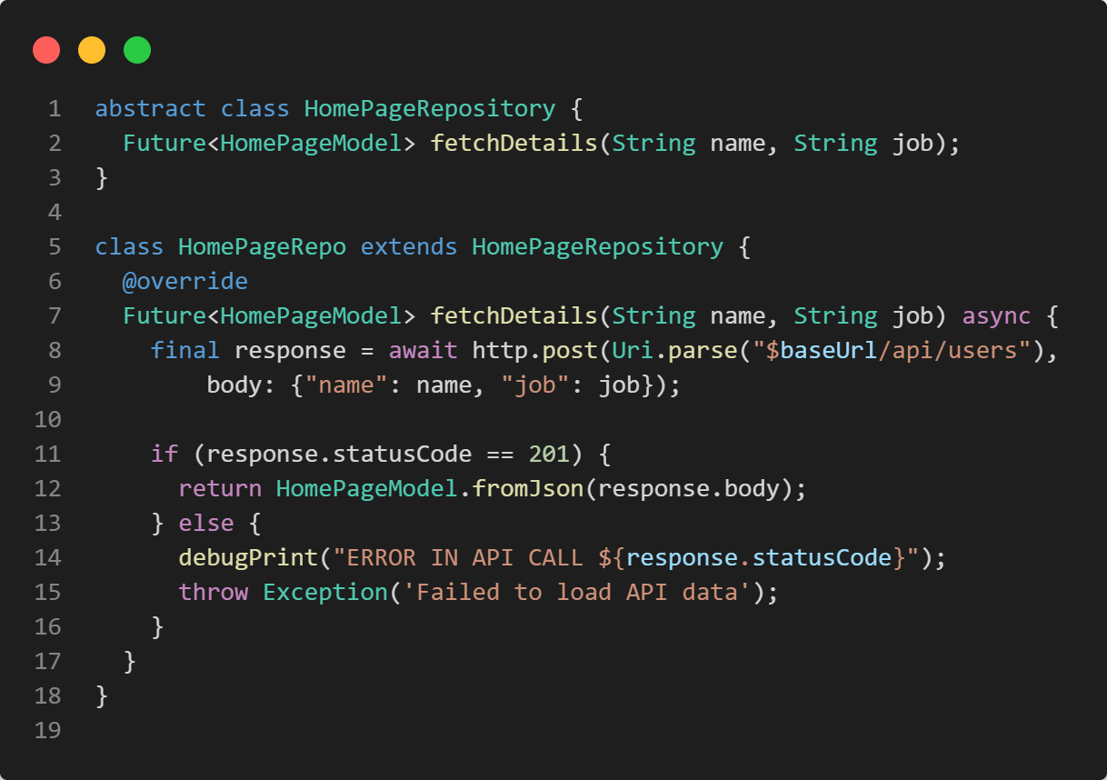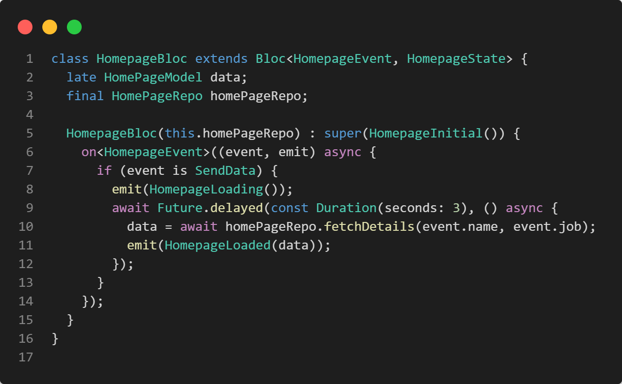 一旦在 UI 中按下搜索按钮触发了“ SendData”事件,我们就会发出“ Homepageloading”状态,这个状态会持续 3 秒钟,然后我们会调用一个方法(fetchDetails ()) ,这个方法是单独写在存储库文件夹中的。