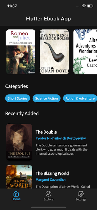 这个项目是一个用于阅读和下载书籍的 Flutter 应用程序。该应用程序中的所有图书都是公共领域(过期版权和完全免费)。它有很多功能,比如下载电子书,阅读电子书,收藏夹,黑暗模式等等。这个项目正在不断更新,在 Github 上有超过 1000 颗星。