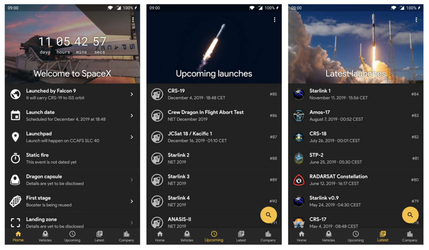 如果你像我一样是 SpaceX 的粉丝,这对你来说可能是一个很好的资源。这个项目的目标是在多个平台上创造最好的 SpaceX 体验。它从开源的 r/SpaceX REST API 获取所有信息,您可以在这里找到它。它提供了很多功能,如发射跟踪及详细信息,车辆目录,船舶跟踪等