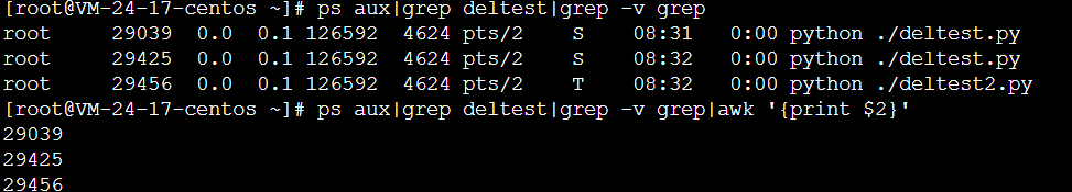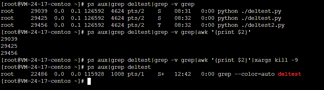 ps aux|grep deltest|grep -v grep|awk '{print $2}'|xargs kill -9ps aux会列出所有的进程,后面碰到管道会将结果传递给第二个命令