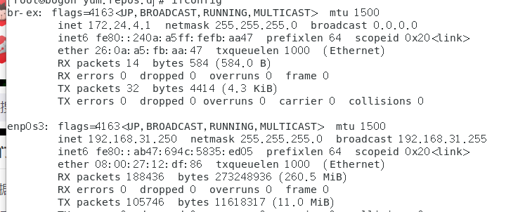 分析:这里使用的vbox,而作为OpenStack节点centos7的ip地址配置在网络接口ifcfg-enp0s3上,而该接口并没有与主机系统的外部桥接口br-ex产生关联,因此需要通过配置将网络接口与外部桥接口br-ex进行关联