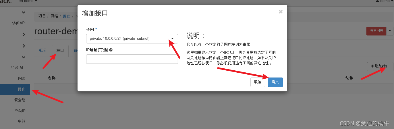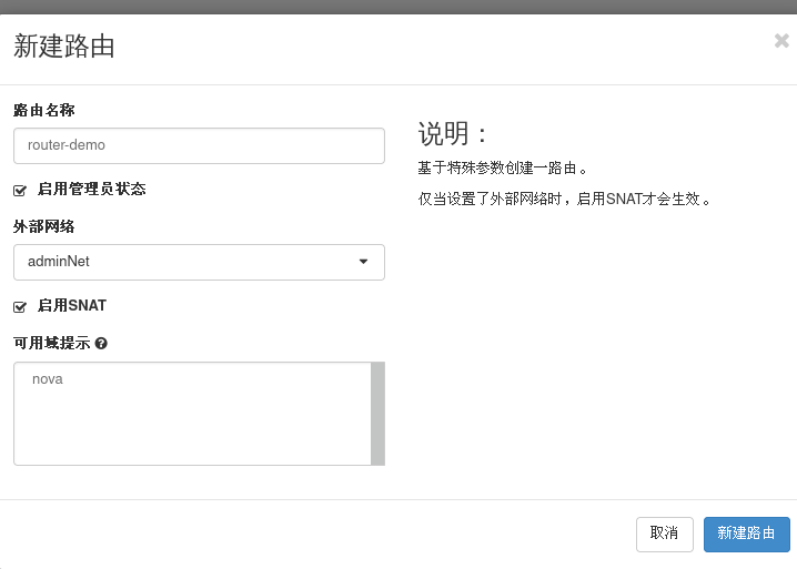 需要新建一个路由来连接内部网络和外部网络,这个配置以各项目为主,