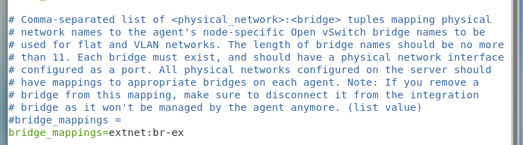 需要注意的是,需要提前将默认虚拟机open vswitch代理配置文件中/etc/neutron/plugins/ml2/openvswitch_agent.ini的网桥映射设置为