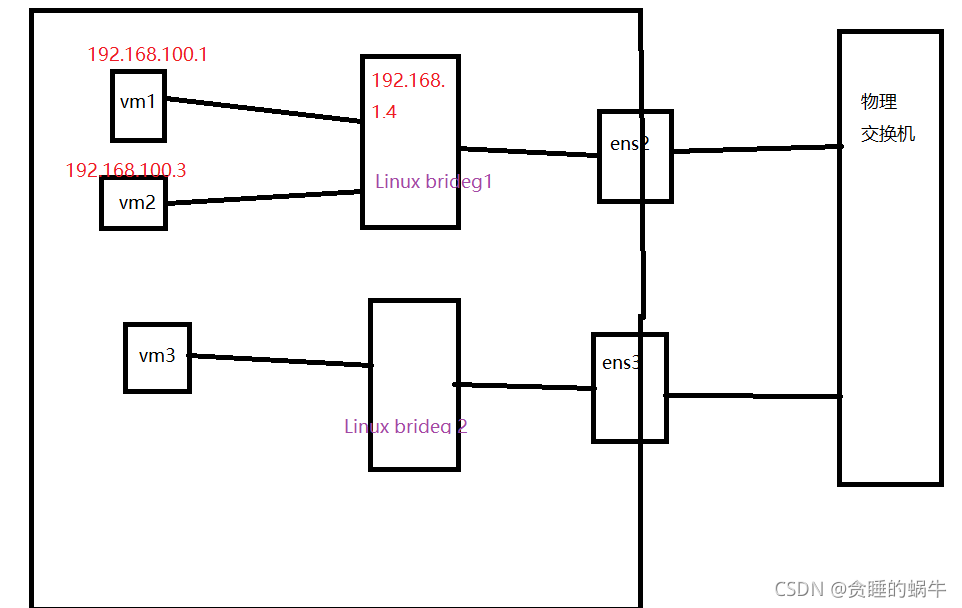 vm1和vm2连接Linux bridge1,两者可以相互通信并通过ens2访问外网