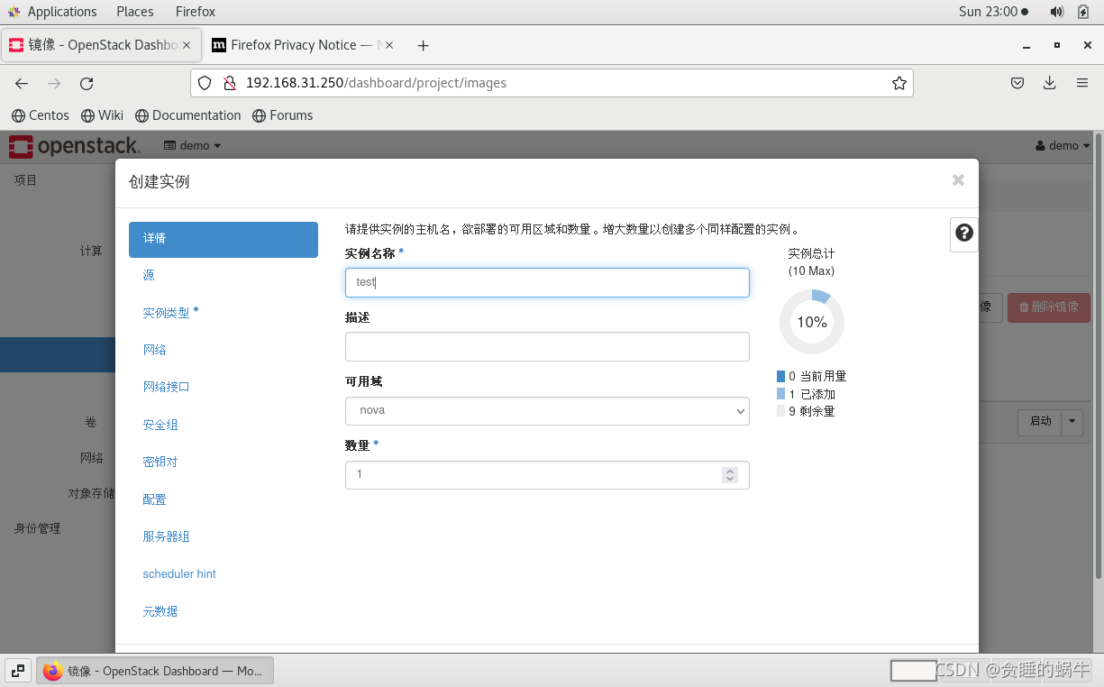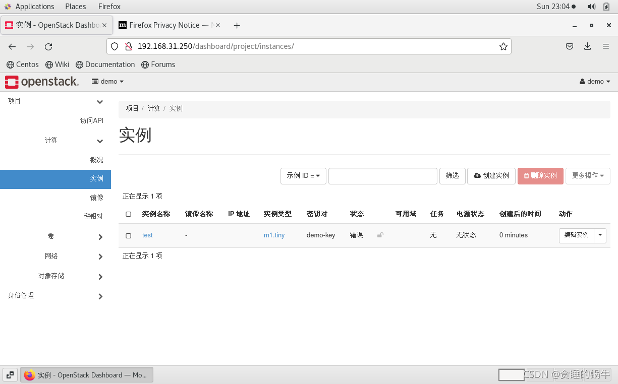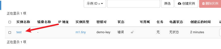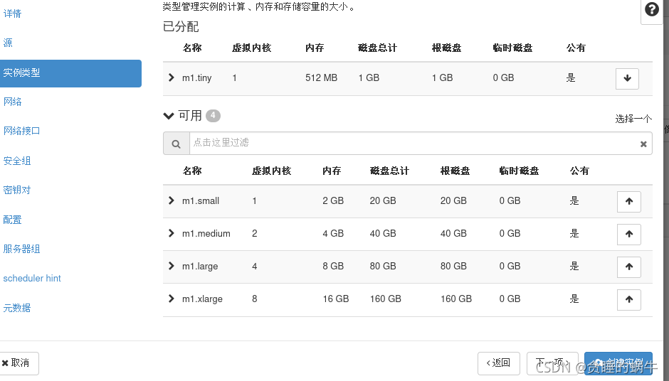 都保持默认设置,实例类型选择系统资源最少的m1.tiny,然后创建实例