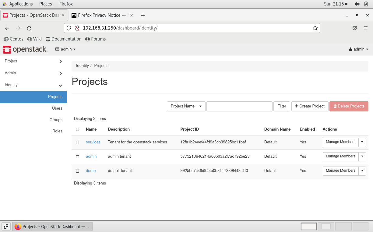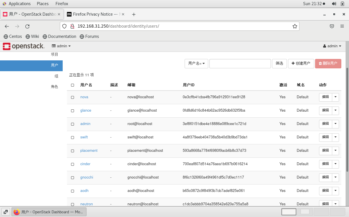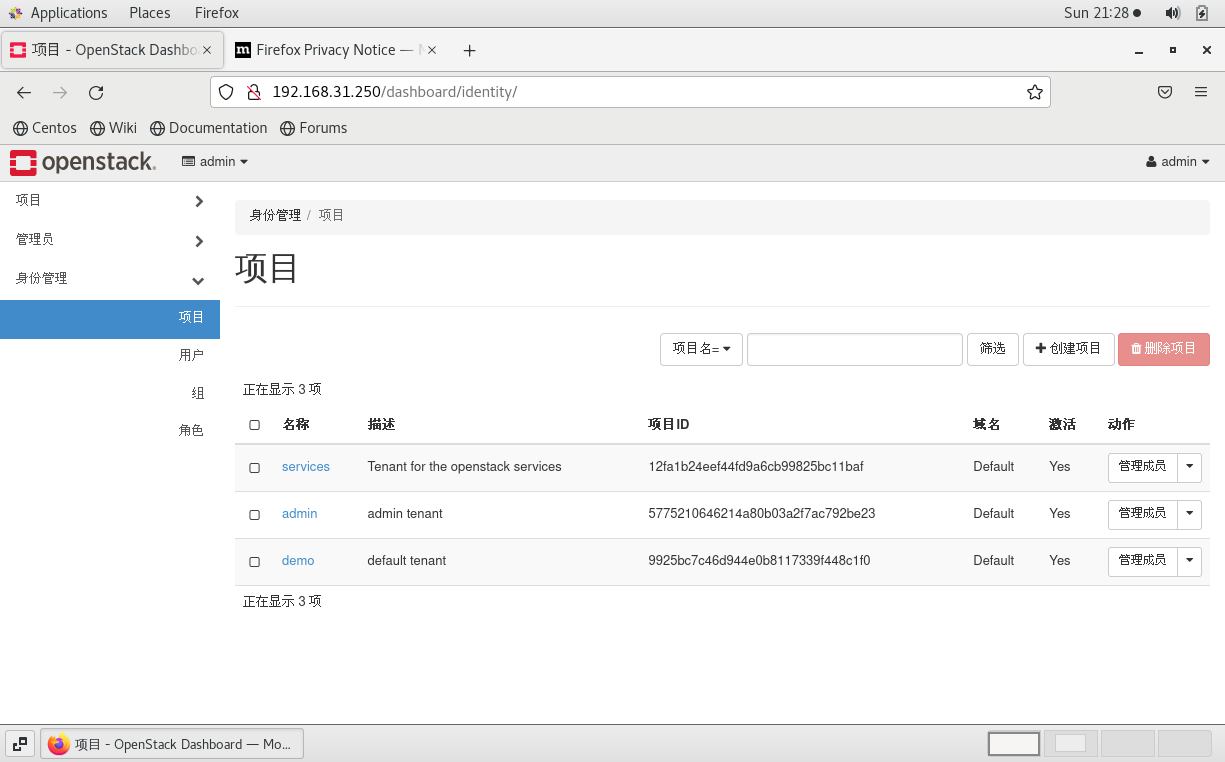 项目提供三个项目,admin、service和demo,OpenStack使用身份服务,云管理员能够管理整个系统的身份信息,普通用户只能管理自己的身份信息。