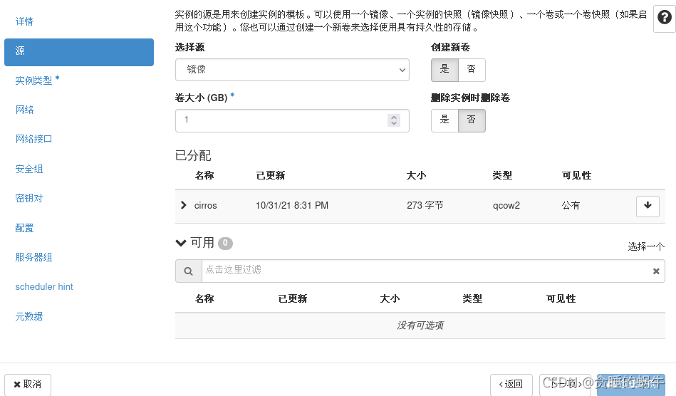 源里面,创建新卷实例使用具有持久性的存储,如果选否将会使用临时性存储。