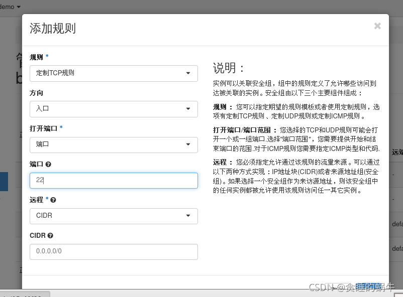然后点击添加规则,添加 22将允许ssh访问虚拟机,然后点击添加