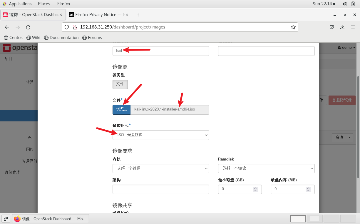 输入镜像名称,把文件导入,镜像格式通过格式进行选择,然后完成创建