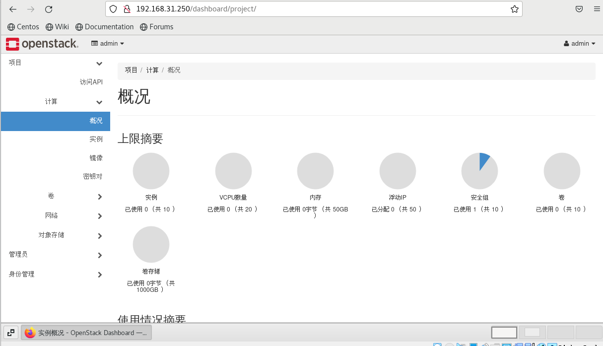管理员界面只有admin账户才能看到此界面,这里执行系统级管理任务,对整个OpenStack系统的资源进行集中管理。